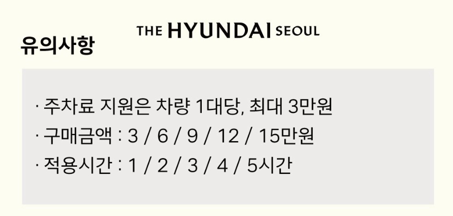 9월 1일부터 더현대 서울 주차장 무료 쿠폰 제공이 종료되었으며, 현재 현대백화점 카드를 사용하는 고객에게만 월 2회, 각 2시간의 무료 주차 혜택이 제공됩니다. 하지만 더현대 서울 주변의 공영주차장을 이용하면 주차비 지원을 받을 수 있으니, 아래 방법을 참고하여 주차비를 절약해 보세요.