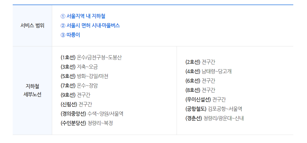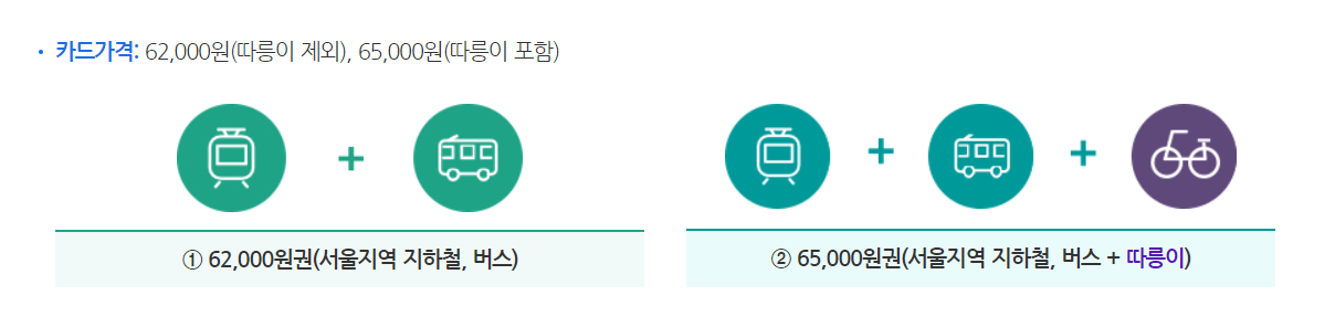- 65,000원권: 서울 지역 지하철 + 버스 + 따릉이 무제한 이용.