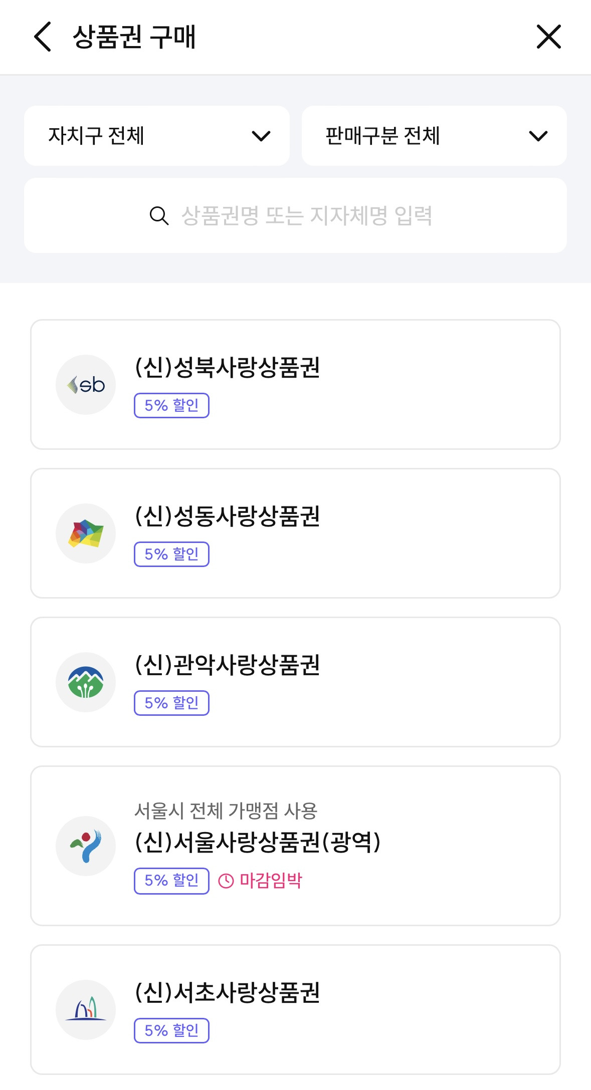 - 구별 상품권 : 예)서초사랑상품권, 구로사랑상품권 등 각 구별로 사용 가능
